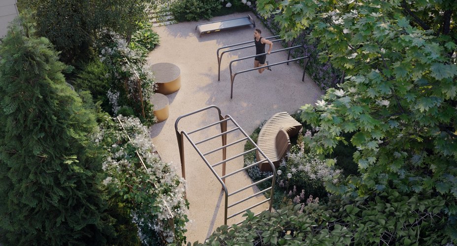 Пространство фитнес-зала занимает 1300 кв. м на двух этажах. На подземном этаже 25-метровый бассейн для спортивного плавания, детский бассейн, спа с хот-табом, сауной и хаммамом. На втором этаже — тренажёры на все группы мышц и зона кардио с видом на парк