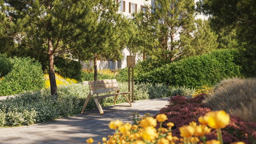 Витражный парк под соснами с насыщенным всесезонным озеленением;