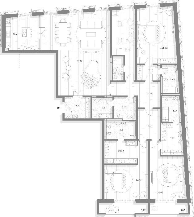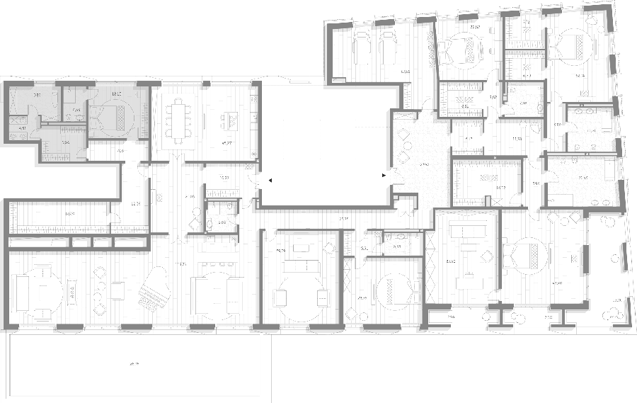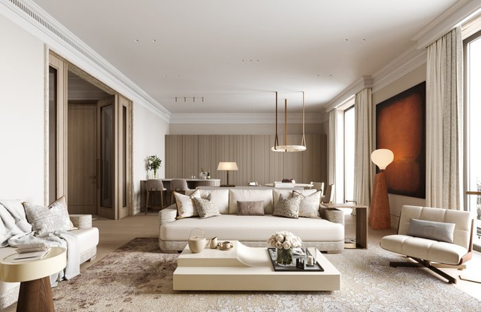 Все квартиры имеют панорамные окна, мастер-спальни с приватным коридором и гардеробными. Также доступны 3 пентхауса площадью от 348 до 706 квадратных метров с видовыми террасами.