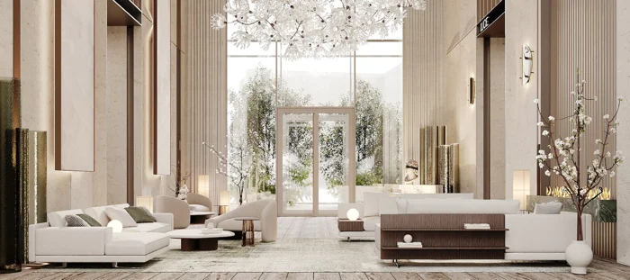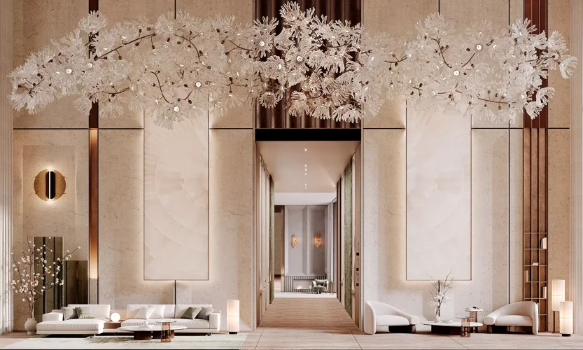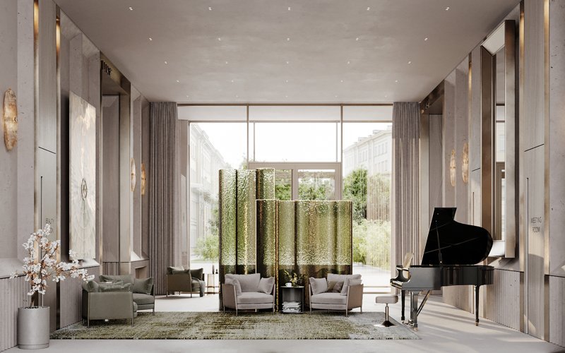 Центральное гранд лобби с потолками высотой 9 м и 2 входные группы по бокам, объединенные общей галереей, лаундж зонами с каминами и переговорными.